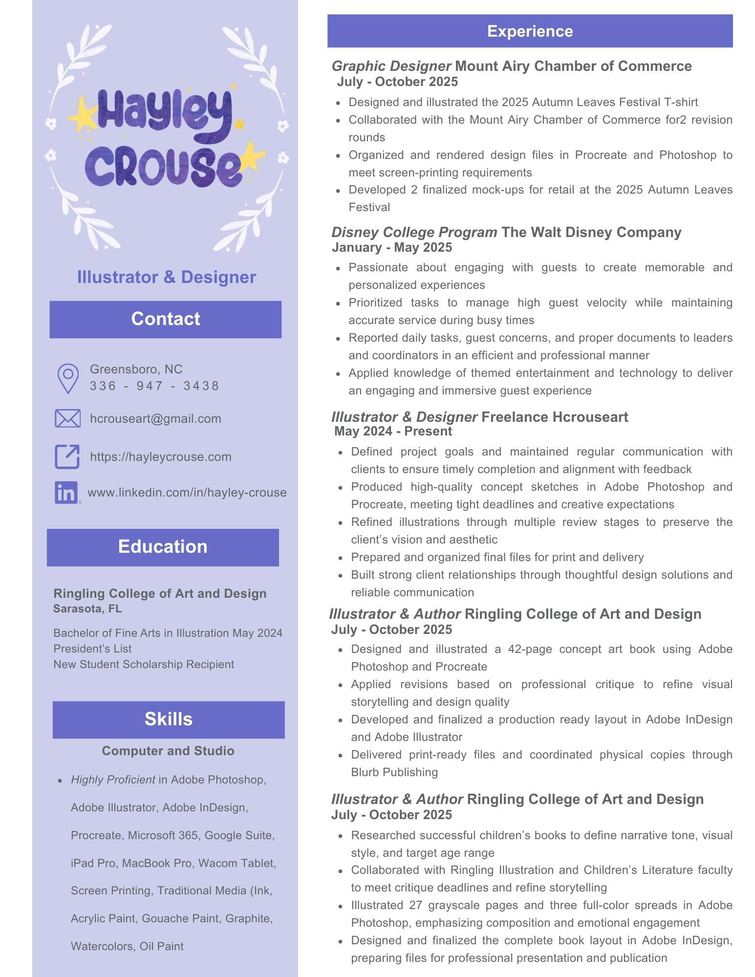 I'm Hayley Crouse, an illustrator and designer currently based in Greensboro, North Carolina. I earned my Bachelor of Fine Arts degree in Illustration from Ringling College of Art and Design in May of 2024.